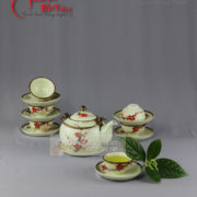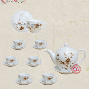 Bộ ấm chén men kem gồm: 1 ấm 6 chén và 7 đĩa kê, 1 bình đựng trà, 1 gạt tàn thuốc lá, 1 bình tráng trà, 1 ống đựng tăm