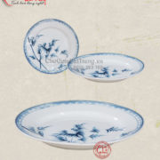 Đĩa bằng vẽ Trúc được làm từ chất liệu sứ xương trong tráng men trắng thể hiện sự tinh khiết và kỹ thuật đạt trình độ cao, với họa tiết vẽ cành trúc được thể hiện hài hòa trên sản phẩm